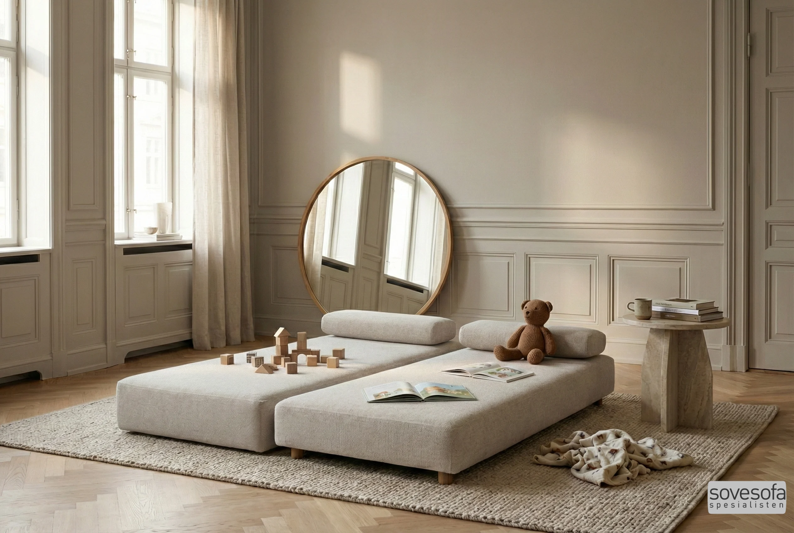 1. Daybed på dagen – Madrassene stablet = en stilfull sofa med sideputer inkludert.